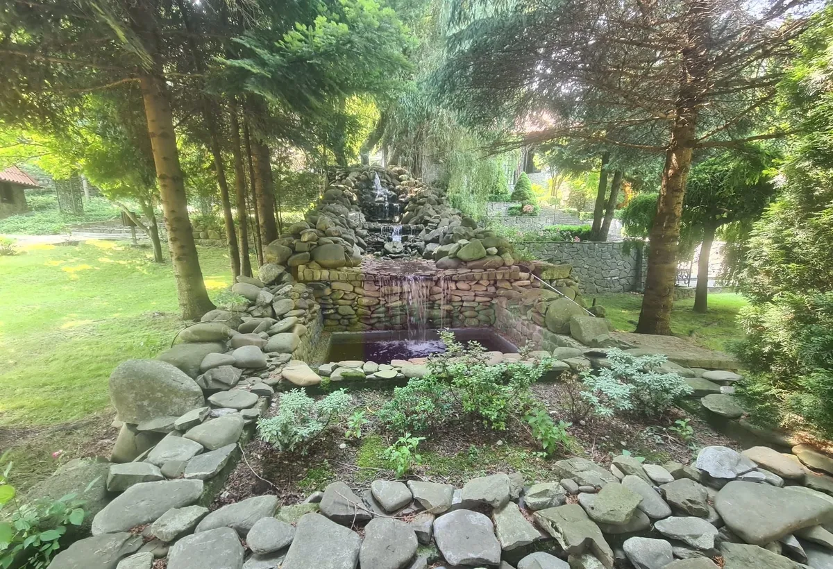 Curtea este frumos amenajata, cu ronduri de flori, plante decorative, brazi, tuia si alei pietonale. Cascada in trepte, amenajata in curte, ofera o atmosfera de relaxare si buna dispozitie.