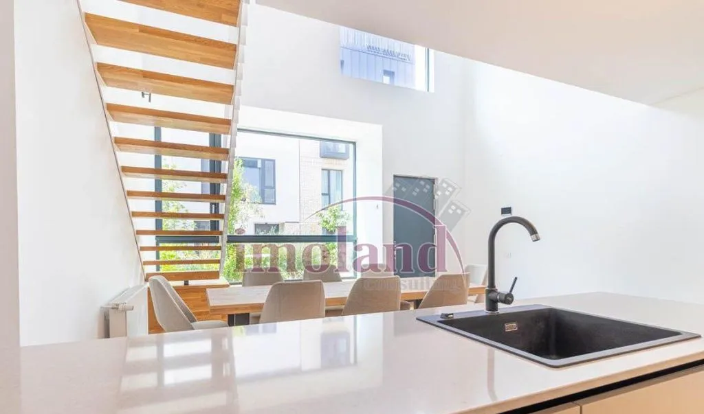 - parter - cu dublu acces dinspre aleea complexului si dinspre garajul cladirii - un spatiu luminos si relaxant, cu un volum impresionant dat de golul de 6 m din zona de dining; tot aici se afla bucataria cu insula complet echipata de la Bosch, un grup sanitar, spalatorie si spatiu de depozitare