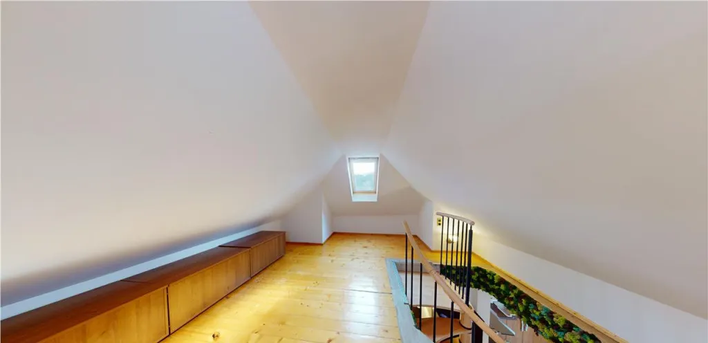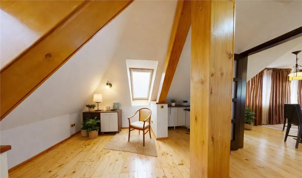 Podul este amenajat ca o camera de lectura, un spatiu intim ce poate fi transformat intr-un birou privat, studio creativ sau camera de oaspeti.